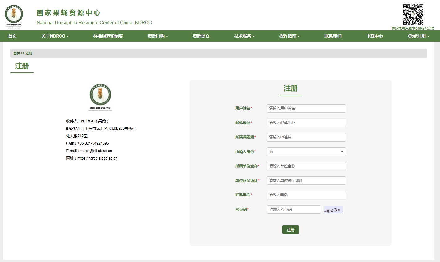 2、按页面要求填写好材料提交申请。所属单位列表里没有的请发邮件到ndrcc@sibcb.ac.cn,系统增加后会发邮件提醒可以注册。